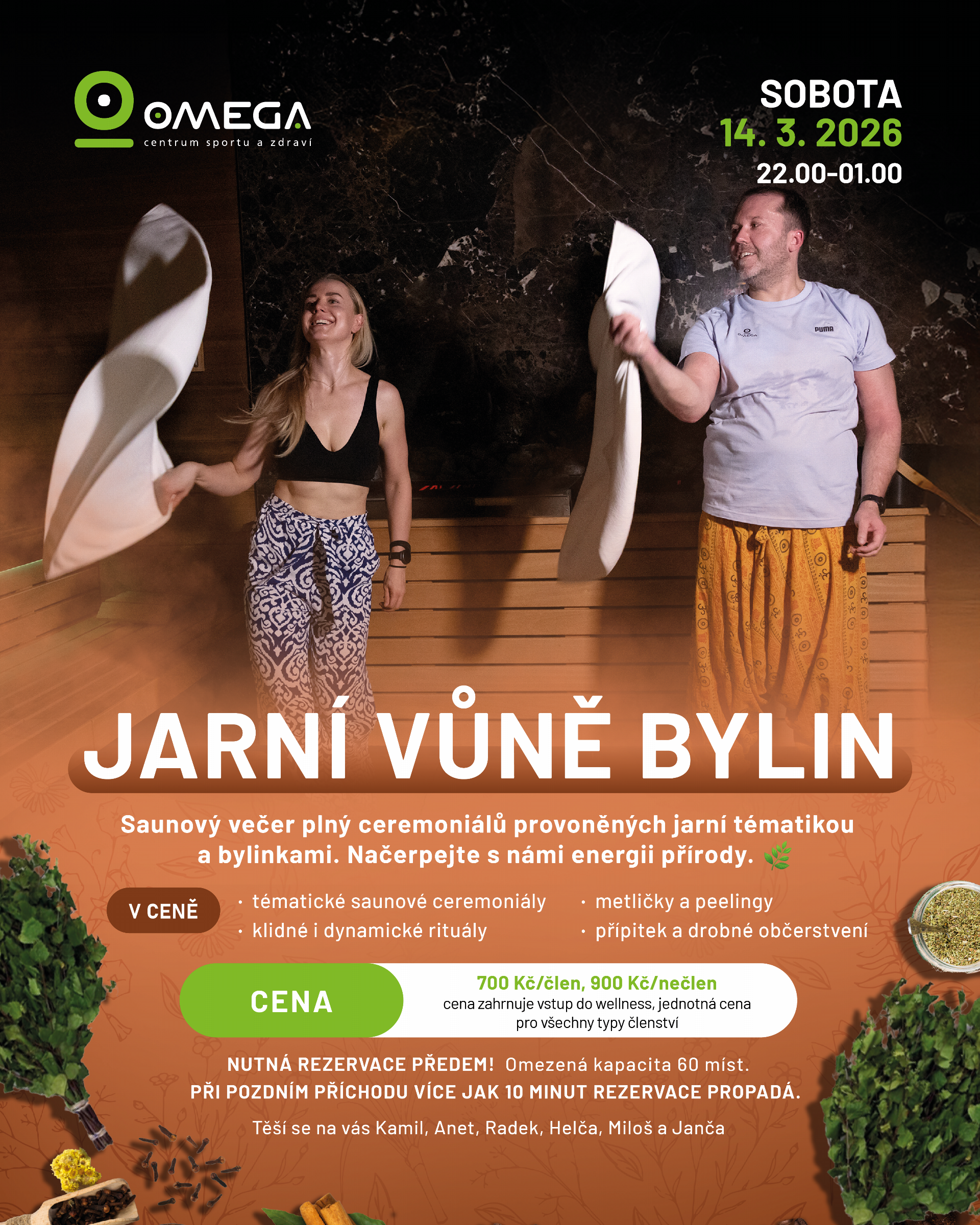 V sobotu 14. března 2026 Vás zveme na tematický saunový večer Jarní vůně bylin, který propojí sílu tepla, vůni čerstvých bylin a jedinečnou atmosféru nočního wellness.